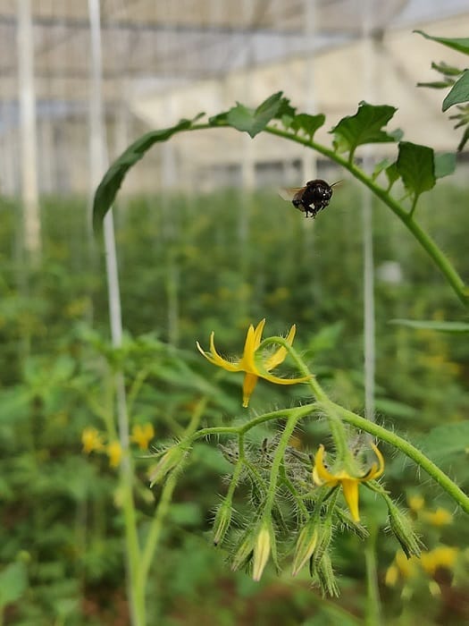 A abelha mandaçaia, contudo, apresenta um comportamento chamado de polinização vibratória (buzz pollination). Isso significa que essas espécies, da mesma forma que o soprador, fazem as flores dos tomateiros vibrarem enquanto coletam o pólen; todavia, ao contrário da máquina, não espalham os fungos. Esse foi um dos motivos de o empresário resolver adotar a partir de agora as abelhas em cultivos de tomateiros orgânicos.