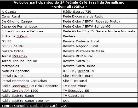 Reportagens veiculadas naRevista Safra ES e o site Safra ES estão entre as 68 inscritas no2º Prêmio Café Brasil de Jornalismo nas categorias TV, Rádio, Impresso e Internet, que disputarão o título de melhores conteúdos sobre “A Importância do Cooperativismo Cafeeiro na Economia Regional ”. A segunda edição da competição é uma realização do Conselho Nacional do Café (CNC) e suas cooperativas em parceria com a Organização das Cooperativas Brasileiras (OCB) e com apoio institucional da Associação Brasileira de Emissoras de Rádio e Televisão (ABERT).