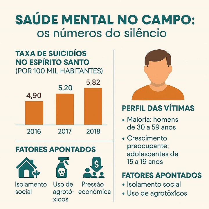 Os dados preocupam ainda mais quando cruzados com informações de outras fontes desta reportagem. Um dos entrevistados cita que o Hospital Estadual de Urgência e Emergência Jayme dos Santos Neves, na Serra, recebe em média três pacientes por semana vítimas de tentativa de suicídio, a maior parte deles oriundos do interior. Esses números são apenas a ponta do iceberg de um problema profundo e muitas vezes invisível, que é o adoecimento emocional de quem vive no campo.