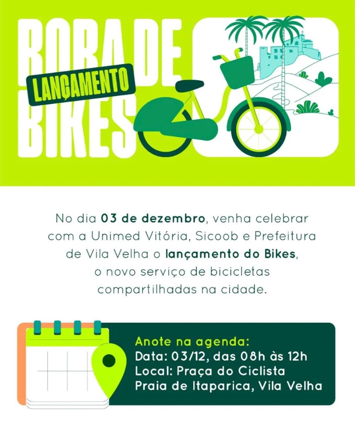 No próximo domingo (03), a Prefeitura de Vila Velha, em parceria com o Sicoob ES e Unimed Vitória lançarão o aguardado sistema de bicicletas compartilhadas, o projeto “Bikes”. Com 21 estações estrategicamente distribuídas e uma frota inicial de 210 bicicletas, os moradores e visitantes terão uma nova e sustentável opção para explorar as belezas da cidade.