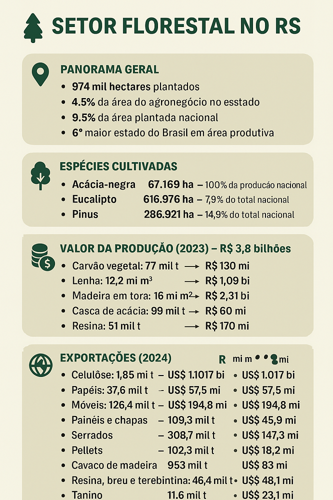 Essa diversidade produtiva se conecta às políticas públicas estaduais. De acordo com a Secretaria do Meio Ambiente e Infraestrutura (Sema/RS), o Zoneamento Ambiental da Silvicultura (ZAS) tornou-se um instrumento central para ordenar a expansão das florestas plantadas, especialmente de espécies como eucalipto, pinus e acácia-negra. Baseado em critérios técnicos e socioambientais, considera desde a aptidão natural dos solos, regime hídrico e cobertura vegetal até a proximidade de nascentes, áreas prioritárias para conservação, territórios indígenas e comunidades tradicionais. Essa matriz garante que a atividade florestal se desenvolva em áreas com maior produtividade e menor risco, conciliando crescimento econômico, conservação da biodiversidade e prevenção de conflitos sociais.
