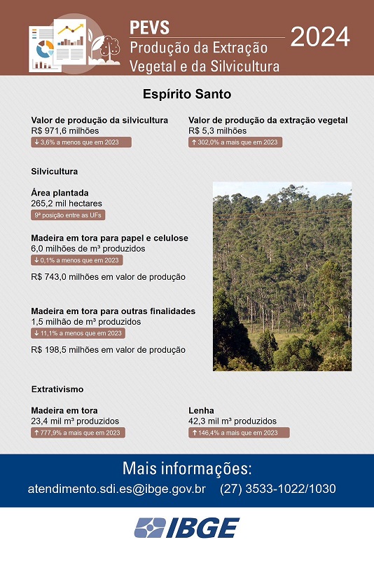 A madeira é uma das matérias-primas mais estratégicas para a economia do Espírito Santo. Além de movimentar bilhões de reais em receita e impulsionar diferentes elos da cadeia produtiva — da floresta à indústria moveleira — ela também carrega um papel cultural, ambiental e social fundamental. Em 2024, o valor da produção da silvicultura atingiu R$ 971,6 milhões, com uma área plantada de 265,2 mil hectares, segundo resultados divulgados nesta quinta-feira (25) pelo Instituto Brasileiro de Geografia e Estatística (IBGE)- confira abaixo.