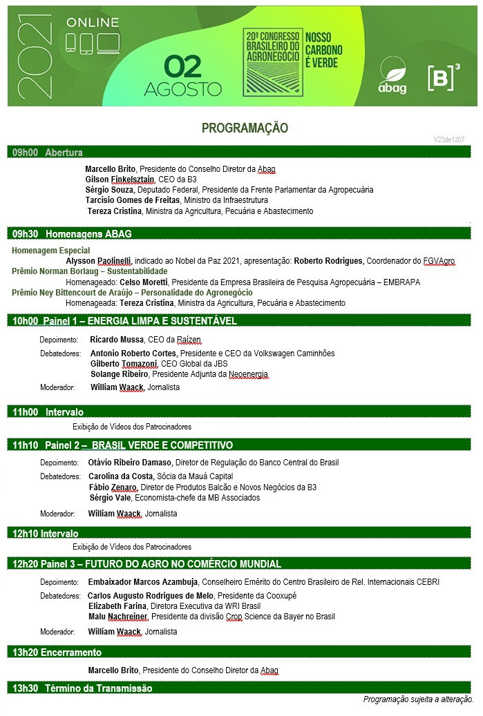 Com a expectativa de reunir milhares de profissionais no dia 2 de agosto, o evento online é considerado um dos mais relevantes do universo do agronegócio brasileiro e contará com as avaliações de importantes especialistas que tratarão do tema central Nosso Carbono é Verde. Eles estarão divididos em três painéis: Energia Limpa e Sustentável, Brasil Verde e Competitivo, O Futuro do Agro no Comércio Mundial para oferecer ponderações embasadas em anos de experiência e estudo, colaborando para ampliar o entendimento e a compreensão nos principais tópicos que norteiam cada temática. As inscrições para participar estão abertas, são gratuitas e podem ser feitas no site oficial.