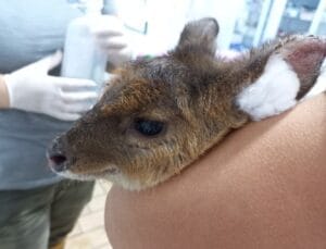 O animal está sob os cuidados dos profissionais do Instituto de Pesquisa e Reabilitação de Animais Marinhos (Ipram)