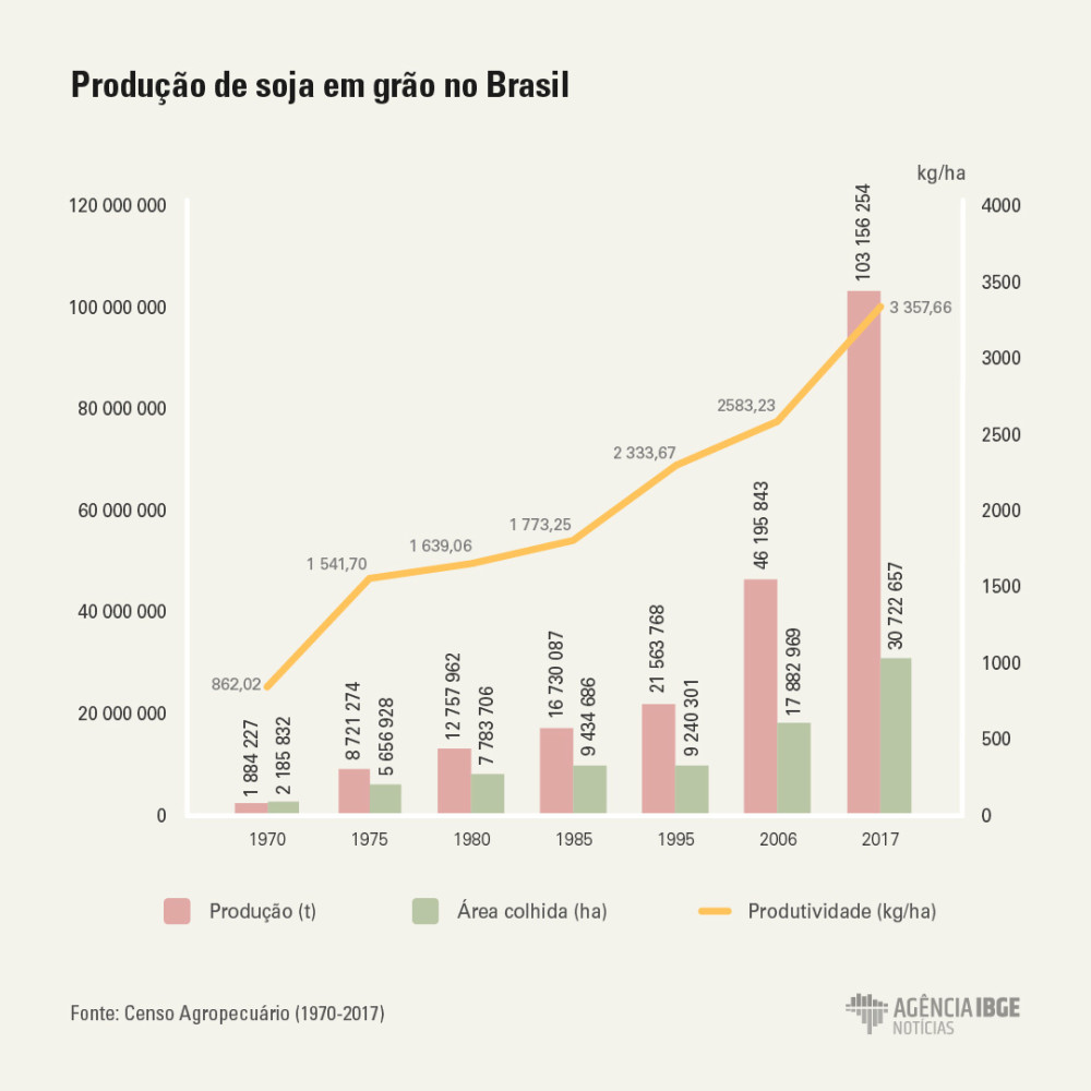 O crescimento do uso de tecnologia no campo, aliado a pesquisas de melhoria genética, tornou possível o aumento das safras de grãos sem que a área da colheita acompanhasse o mesmo ritmo de crescimento. Um exemplo é a soja, cujo volume de produção mais que dobrou, crescendo 123% entre 2006 e 2017, enquanto sua área de colheita aumentou 72%. Nesse período, passou-se a produzir 3,4 toneladas de soja por hectare, quase 30% a mais que em 2006. Os dados são do Censo Agropecuário, divulgado pelo IBGE em outubro (25).